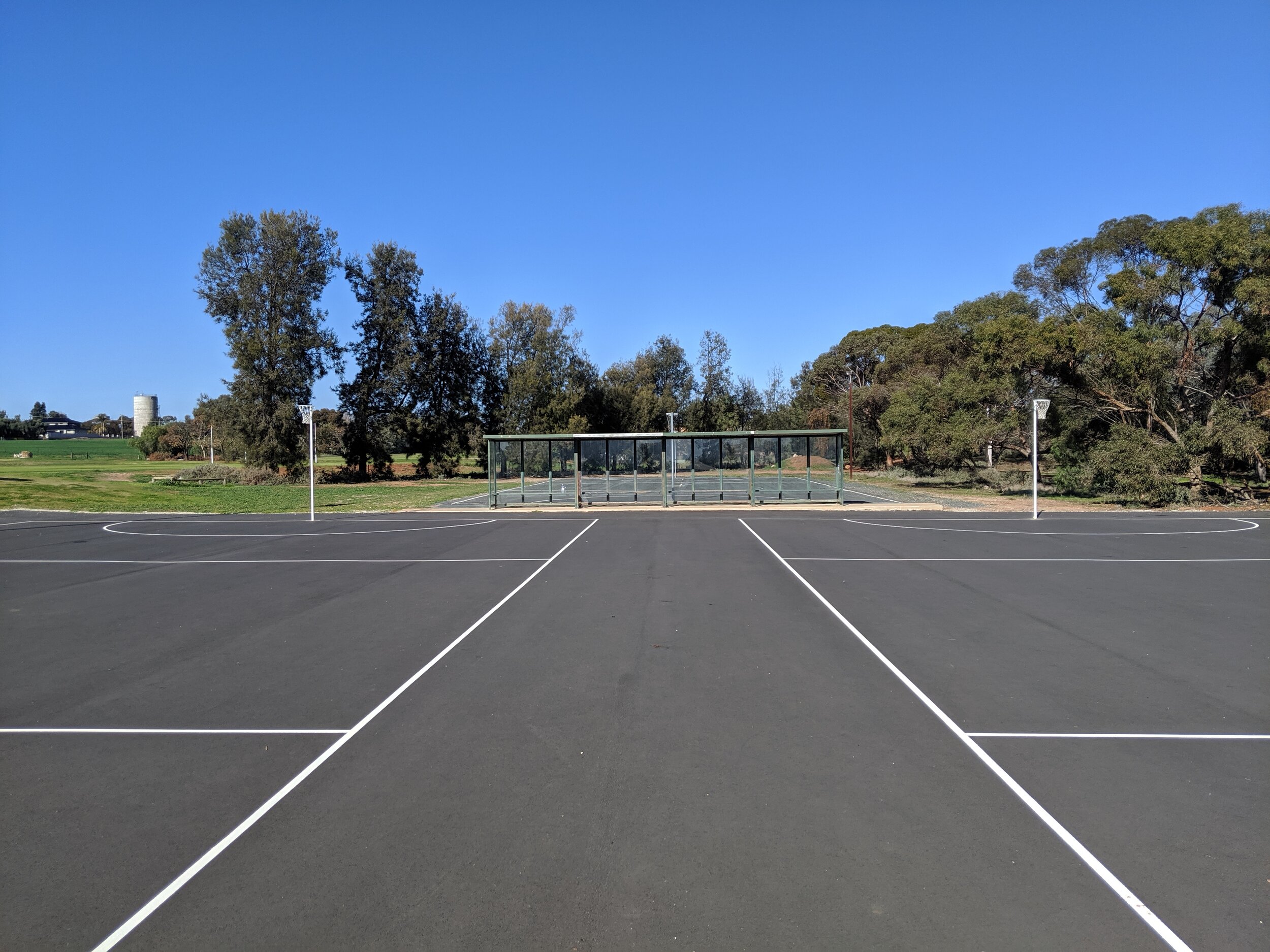 Netball court redevelopment project for the Murray River Council. This included the installation of two new asphalt netball courts, goal posts and pads, player and spectator shelters, as well as line marking.